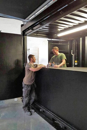 The container bar was fabricated using a 20ft new side opening container with 50 x 50 bi-fold doors. The container cellar was fabricated using a 10ft new container. The concertina doors on the 20ft side opening container were lined with 12mm ply wood, this was for advertising and marketing use. Both containers were prepared and painted black (RAL9005), internally and externally. The ply wood was also painted in this colour; this was to enable the logos, vinyl and paintwork to stand out. Within the containers we supplied a full electrical and lighting package, a full length custom made bar on both of the 20ft sides. The front bar included a tier of shelving; this was to be used for product storage; the back bar was being used for bottle fridges. Because our client needed to install two beer tanks on the container roof, we had to ensure it was able to take the weight of the tanks. These tanks weigh 3 tonnes in total when full, so we re-enforced and strengthened the container roof with steel sheet and fabricated and fitted an extremely heavy duty steel frame unit. The build was completed in just 8 weeks, we arranged delivery and off-loaded the containers in the football stadium, where they were positioned and ready for a final fit out and branding.